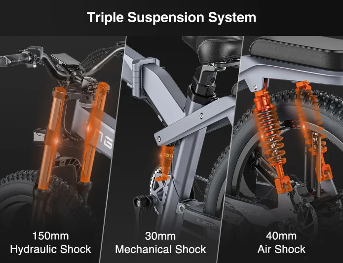 The X26 is equipped with a triple shock absorption system from the front hydraulic shock absorber, the middle mechanical shock absorber to the rear air shock absorber, and the X26 of other electric bicycles has a shock absorbing capacity 3 times stronger than ordinary electric bicycles.