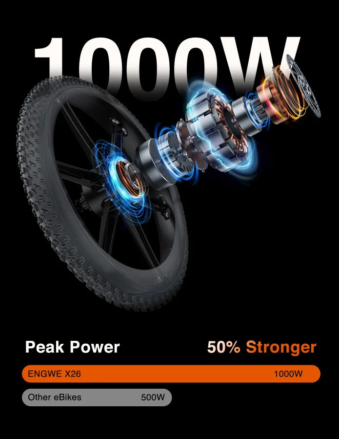 We designed the ENGWE X26 to have an integrated one-piece wheel that combines the spokes and frame to provide ultimate stability while resisting compression better than other e-bike wheels.